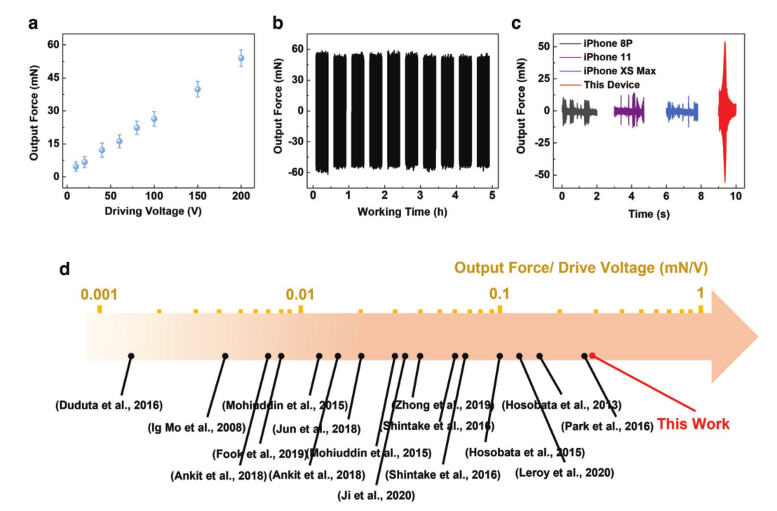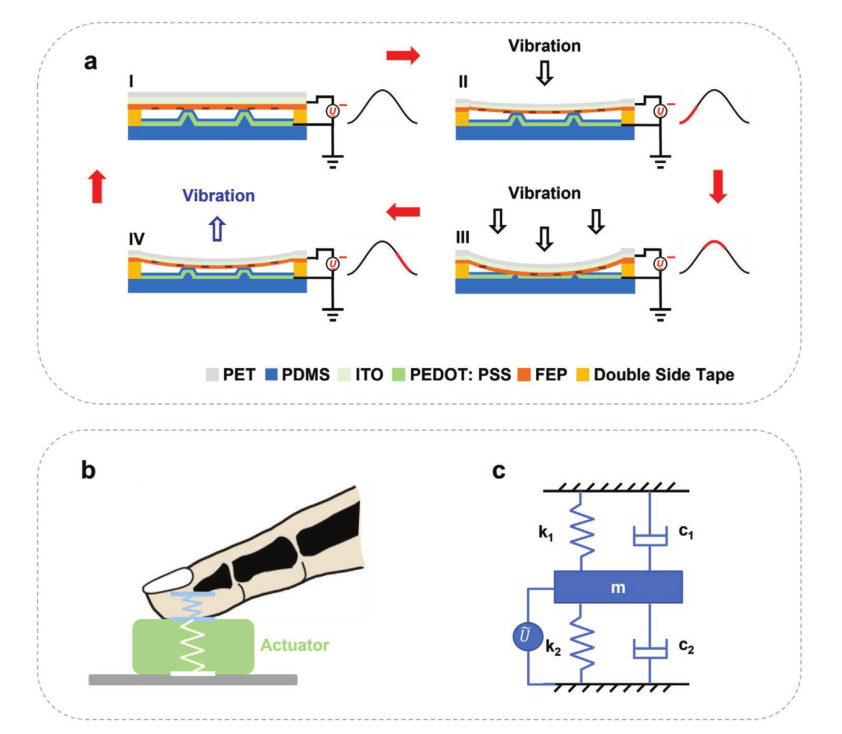 近日,开云线上(中国)网页版深圳国际研究生院先进制造学部钱翔、王晓浩团队和美国加州大学伯克利分校林立伟团队合作,利用气流辅助电晕充电装置对驻极体薄膜材料充电,构建了聚二甲基硅氧烷(Polydimethylsiloxane, PDMS)、全氟乙烯丙烯共聚物(Fluorinated ethylene propylene, FEP)及导电聚合物PEDOT:PSS组成的三明治结构的柔性执行器系统(图1)。器件在具备柔性的同时透明性能也较好,可以覆盖在任何有触觉反馈需求的人机交互系统表面。通过理论模型和实验验证表明,这种柔性驱动器的驱动电压可在低至20V时保留刺激皮肤的感觉,实现基本的触觉反馈功能。在200V的驱动电压下,该系统可以产生约55mN的输出力,大于一般市售手机在振动模式下的输出力(图2)。该柔性驻极体执行器阵列可通过任意波形编程方式在人体皮肤上产生可分辨的空间和强度差异,从而可以编辑出不同“指令”式的触觉反馈信号。