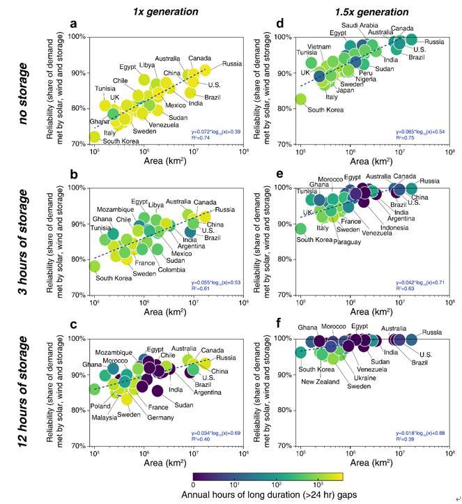 长时储能系统可有效弥合美国、中国等国土面积较大国家的电力缺口。相比之下,国土面积相对较小的国家构建100%风光互补发电系统将面临更为严峻的挑战。以英国、韩国等国家为例,配备12h长时储能容量的风光互补发电系统仍会有约2000小时的电力供应缺口,由此表明储能系统有效消纳更多波动性风光电力的能力十分有限。研究进一步揭示,区域资源共享方案可有效消纳各国不均匀的太阳能和风能资源,如整合调度部分弃风弃光,国家尺度风光互补发电系统可靠性可从最低57%提升至近90%。