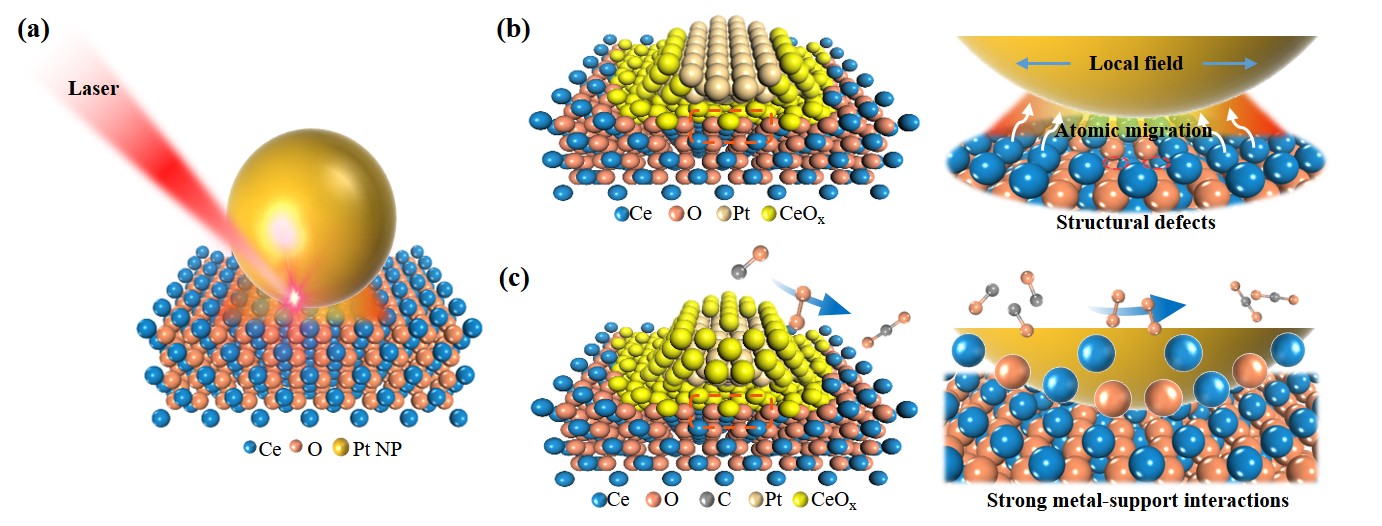 在这一工作中,以Pt/CeO2这一体系作为主要研究对象。研究发现,激光辐照过程中Pt和CeO2界面的电场强度明显高于其它地区,这表明纳米约束电场在SMSI的形成过程中发挥着关键作用。在局部场激发下CeO2载体表面形成了缺陷和亚稳态CeOx物种,同时在激光的诱导下亚稳态CeOx向Pt颗粒迁移,并在表面形成几个原子层厚的非连续多孔包覆层。由于包覆层的多孔特性,使得催化剂具有更好的催化活性和稳定性。利用超快激光这一策略,我们也在其它负载型贵金属体系如Au/TiO2、Pd/TiO2、Pt/TiO2、Pt/Al2O3、Au/MgO、Pt/SiO2普适性的实现了SMSI效应,为构筑金属-载体相互作用开辟了一条全新的思路。
