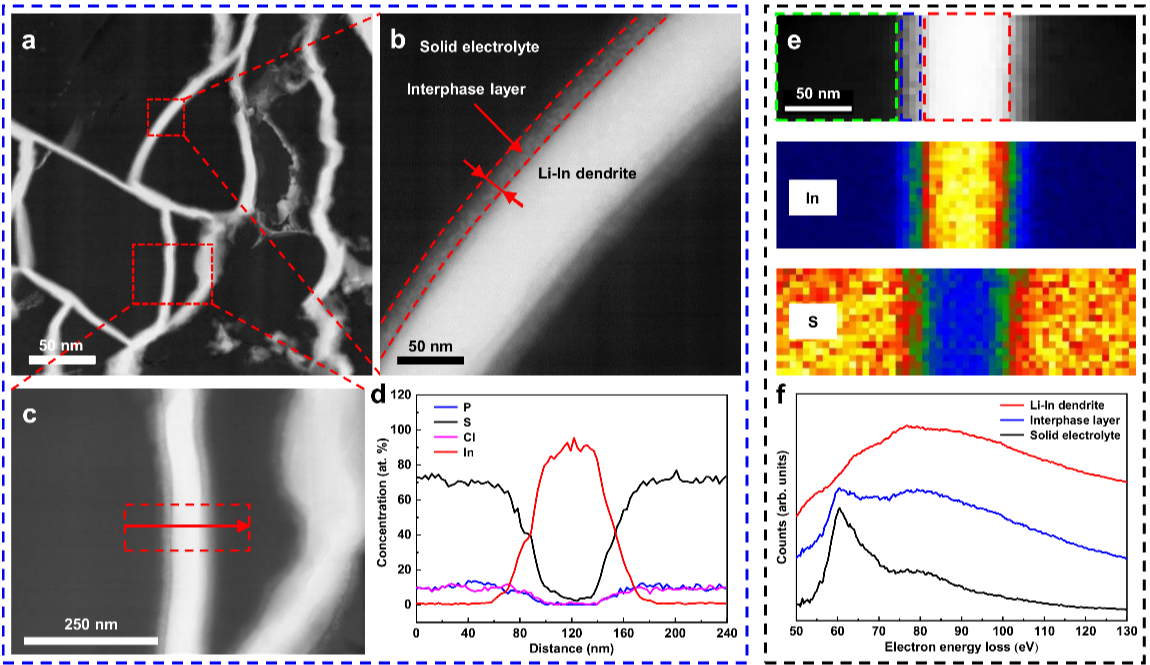 锂铟枝晶的STEM-HAADF图像和EELS分析。(a)锂铟枝晶的STEM-HAADF图像;(b)LPSCl-LiIn的中间界面层;(c)用于EDX测量的锂铟枝晶图像;(d)沿红色箭头方向P、S、Cl和In元素的线性分布;(e)LPSCl-LiIn界面In和S元素的EELS扫描;(f)锂铟枝晶、中间界面层和LPSCl电解质的EELS光谱。