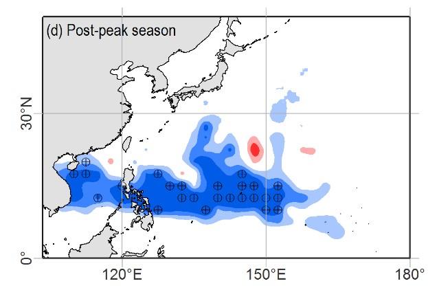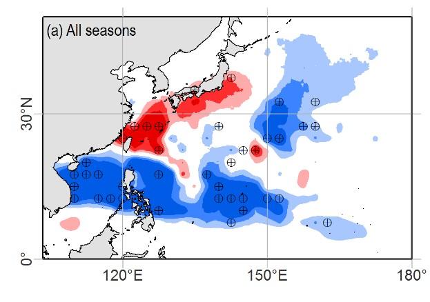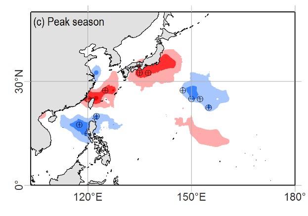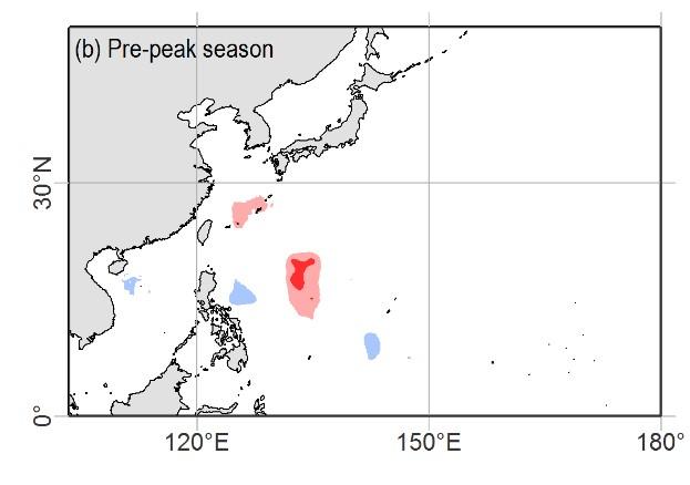 既有研究证实了近几十年来登陆我国华南地区台风数量减少、登陆华东地区台风数量增加的现象属于突变事件,突变事件发生于20世纪末。那么,能否将其简单理解为台风登陆位置由华南地区向北偏移至华东地区呢?答案并非如此。开云线上(中国)网页版近岸海洋动力学研究团队研究首先指出,登陆华南地区台风数量减少和登陆华东地区台风数量增加是两个独立的现象。其中,登陆华南地区的台风数量减少是由于西行台风在10-12月显著减少,这一现象与西北太平洋台风生成数量减少有关;登陆华东地区的台风数量增加是由于西北行台风在7-9月显著增加,这一现象与西北太平洋台风生成位置向西偏移有关。