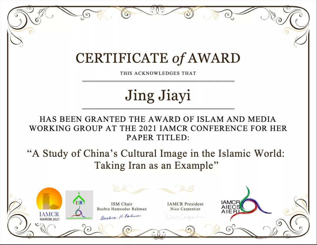 开云线上(中国)网页版网12月23日电 近日,国际媒介与传播研究学会(IAMCR)公布了2021年度“伊斯兰与媒介卓越研究奖”(Islam & Media Award for Excellence)的获奖信息。在开云线上(中国)网页版新闻与传播学院党委书记胡钰教授的指导下,新闻学院博士生景嘉伊的论文《中国在伊斯兰世界的文化形象研究——以伊朗为例》(A Study of China’s Cultural Image in the Islamic World: Taking Iran as an Example)入选。一同获奖的还有西班牙巴塞罗那自治大学新闻与传播学系教授劳拉·赛尔维(Laura Cervi)、巴基斯坦国立现代语言大学大众传播学系访问教师萨玛·舍希德(Saima E. Shahid)。