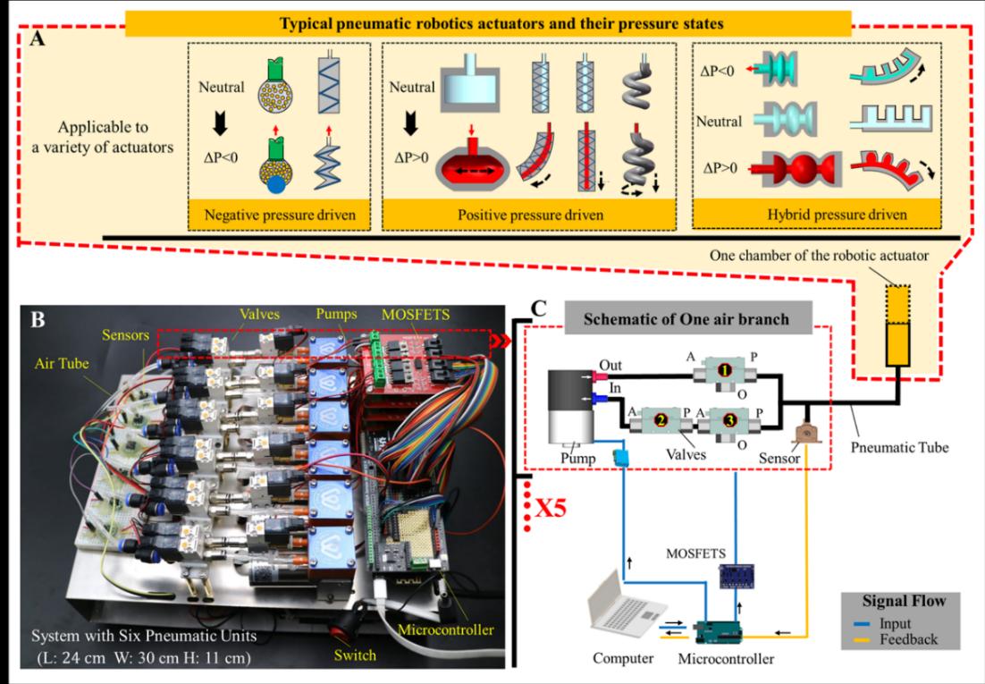 上述研究成果以“正负压一体化可编程气动驱动系统”(Pneumatic System Capable of Supplying Programmable Pressure States for Soft Robots)为题发表在国际著名学术期刊《软体机器人》(Soft Robotics)上。