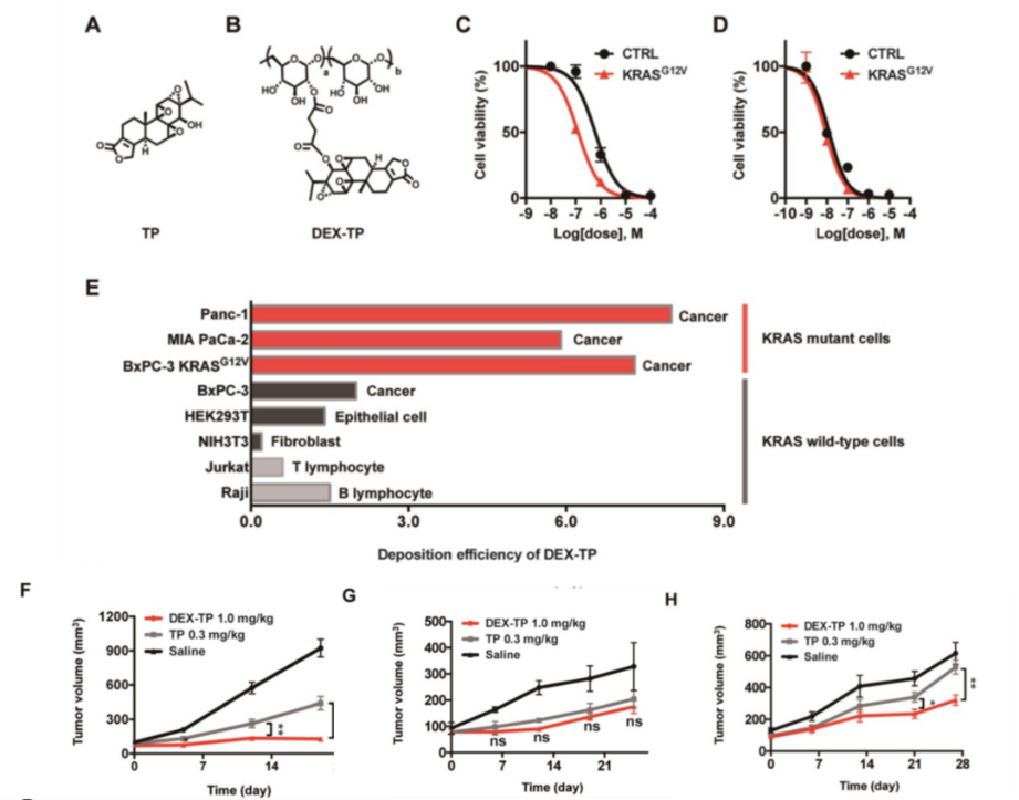 作者通过酯键的方式将小分子药物TP与70kDa的Dextran进行了偶联(图2 A和B),通过比较TP和DEX-TP对BxPC-3和BxPC-3 KRASG12V细胞的疗效,发现DEX-TP对KRAS突变表现出更强的药物疗效(图2C),而TP没有选择性(图2D)。
