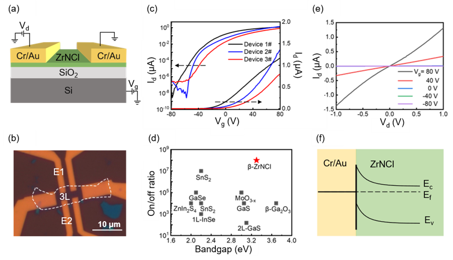 同时,少层的ZrNCl表现出了良好的空气稳定性和电学性质。研究发现,将所制备的材料置于空气中数月后,原子分辨的原子力显微镜照片(AFM)显示样品表面晶体结构依然完整,且拉曼特征峰未发生明显偏移,说明样品具有良好的空气稳定性。为探究二维ZrNCl在电子器件方面的应用潜力,研究人员使用电子束光刻技术和电子束蒸发沉积技术,构建出以少层ZrNCl为沟道材料的背栅场效应晶体管器件。结果表明基于少层ZrNCl材料的器件的电流开关比达108,高于之前报道的其他宽带隙二维半导体材料。器件的场效应迁移率为3.15cm2V-1s-1,远低于理论值,说明通过改善电极与材料之间的接触、优化器件构建工艺等方法有望进一步提高ZrNCl的电学性能。