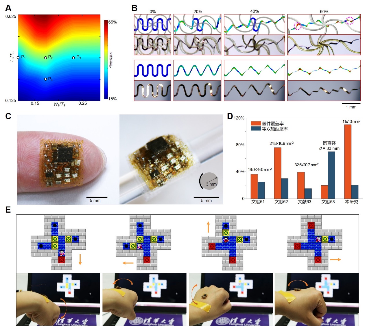 A,B:网格封装蛇形导线参数分析及变形机理;C:实现的小型化多功能无线柔性电子器件实物图;D:本研究与之前报道工作覆盖率和延展率对比;E:无线鼠标推箱子应用演示
