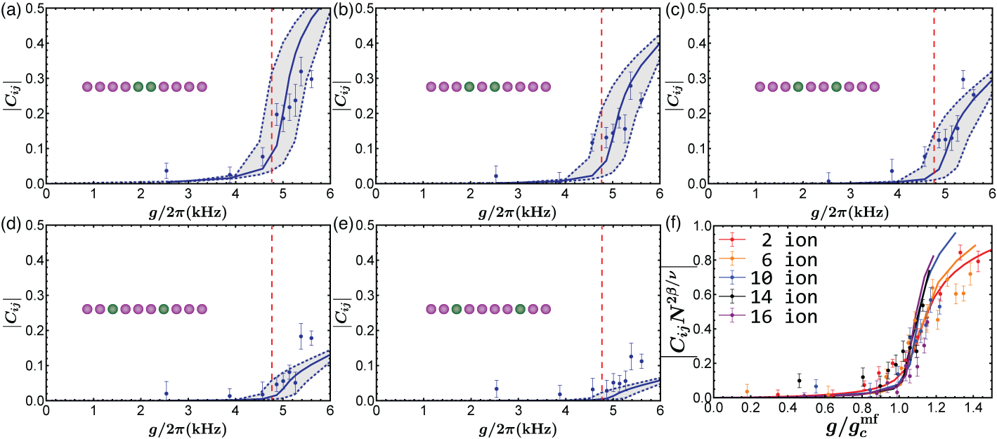 得益于离子阱量子模拟平台的高度可控性,研究人员实现了对拉比-哈伯德模型的可控量子模拟研究。研究人员通过对激光的精密操控实现了离子量子比特与局域声子的相互作用,而离子阱系统中的库伦相互作用形成了不同离子间的局域声子交换项。在这项工作中,研究人员通过量子相变和量子动力学两个方面验证了拉比-哈伯德模型的成功实现。在量子相变方面,研究人员通过绝热演化实现了相干相和非相干相之间的转化,在此过程中通过测量空间自旋关联这一序参量,成功在不同规模的离子阵列中观测到量子相变现象,且与DMRG方法近似计算的结果相符。