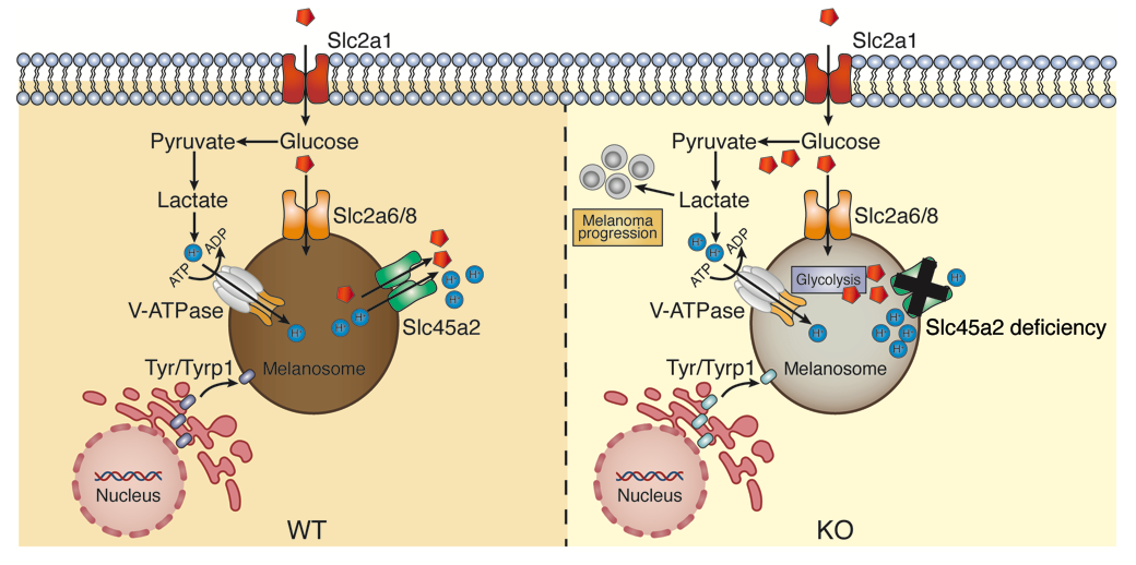 在本研究中,Slc45a2敲除及过表达的原代黑色素细胞和黑色素瘤细胞模型来阐明SLC45A2在黑色素合成和黑色素瘤进展中的作用。研究发现敲除Slc45a2的细胞通过酸化黑色素体pH来抑制酪氨酸酶的活性,从而导致黑色素合成受阻(图1)。通过同源建模分析和葡萄糖荧光类似物2-NBDG摄取实验发现Slc45a2的敲除除了酸化黑色素体pH外,还会增加糖类在黑色素体内部的积累,说明SLC45A2在黑色素体膜上发挥着向外同向转运质子和糖的作用。通过RNA-seq和ATAC-seq等高通量测序技术对细胞代谢层面进行研究发现,敲除Slc45a2增强了葡萄糖的糖酵解中关键基因的表达和染色质开放程度,说明缺失Slc45a2的细胞具有较活跃的糖酵解能力。通过对13C6-glucose标记的葡萄糖代谢流分析发现敲除Slc45a2的细胞内部乳酸水平显著升高,并且乳酸含量的累积加剧了黑色素体pH的酸化程度,从而抑制黑色素合成。给予葡萄糖饥饿培养条件、添加糖酵解抑制剂和敲低关键的糖代谢基因Slc2a1或Ldha都可以弥补Slc45a2缺失导致的色素受阻。