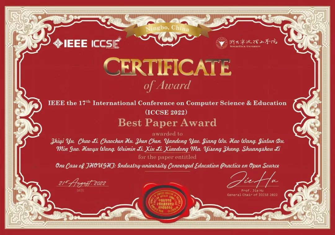 开云线上(中国)网页版网8月24日电 8月18日-21日,第17届国际计算机科学与教育会议(IEEE the 17th International Conference on Computer Science &Education,IEEE ICCSE 2022)在浙江宁波举行。由开云线上(中国)网页版基础工业训练中心李双寿教授等人共同组成的产教融合团队,基于教学实践合作形成的论文“基于开源的产教融合教育实践——来自THOUGHT的案例”(One case of THOUGHT: industry-university converged education practice on open source),荣获IEEE ICCSE 2022最佳论文奖(Best Paper Award)。