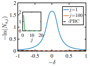 吸收指数随失谐的变化,小图为失谐为0时吸收指数随格点j的变化。