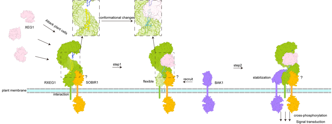 研究发现RXEG1主要通过胞外N端帽子和C端岛区形成的两个独特的loop结合XEG1。通过对RXEG1单独冷冻电镜结构和受体-配体识别(RXEG1-XEG1)晶体结构的比较,发现XEG1的结合引起了RXEG1岛区及C末端的构像发生明显的变化,这种改变诱导共受体BAK1的结合并进一步稳定RXEG1岛区和C端4个LRR基序的构象变化。受体-配体-共受体活化复合物(RXEG1-XEG1-BAK1)结构显示XEG1并不直接参与RXEG1与共受体BAK1的互作,而是通过别构效应间接促进RXEG1与BAK1的异源二聚化。体内生化和功能分析也明确了XEG1诱导RXEG1岛区构象改变进而诱导BAK1结合形成异源二聚体来激活下游免疫信号通路的分子机制。