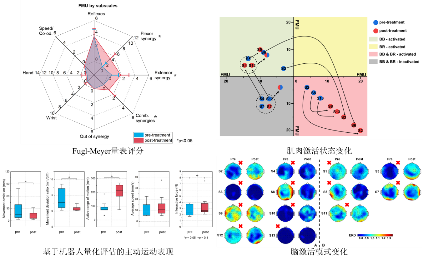 本研究募集了一批发病六个月内伴有运动功能障碍的卒中患者,每位患者均接受为期两周的个体化脑机交互训练。每位患者训练前进行大脑运动意图表达脑区识别,并将每位患者的运动意图特征和神经重组模式纳入到脑机交互训练设计中,依据其个体差异性表达构建神经重组脑区与患肢动作行为间的运动感觉闭环,从根本上理解患者受损特征、促进个体化神经环路高效重建。