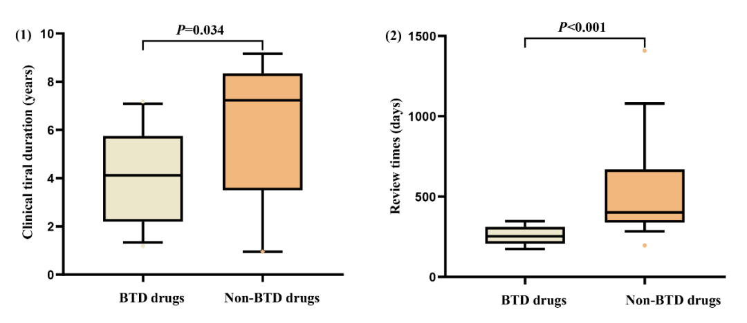 图3.对比BTD药物和非BTD药物在临床试验时间和审评时间方面的差异