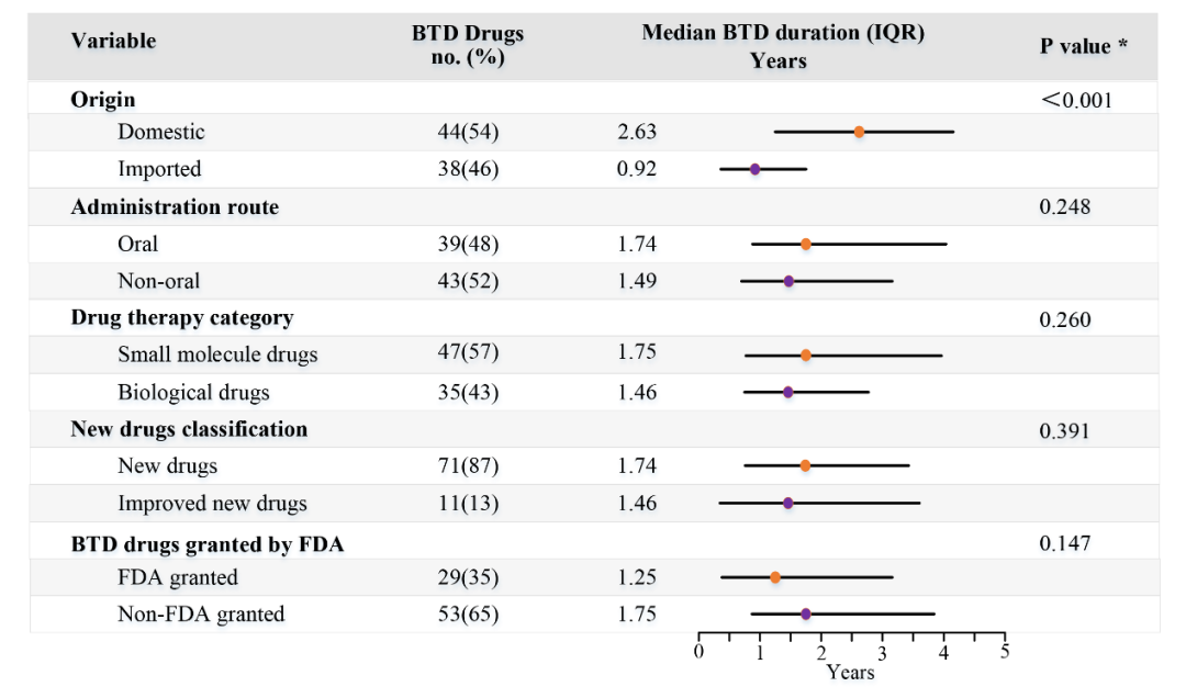 课题组对获得BTD药物的时间(从IND批准时间至BTD批准时间)进行了单因素影响分析,发现获得BTD时间与是否为国产或进口新药相关,而与给药途径(口服或非口服)、药物类型(小分子药物或生物制品)、药物分类(新药或改良新药)以及是否获得FDA的BTD无明显关系(图2)。这可能与我国2018年开始接受境外临床试验数据有关。由于部分进口新药在进入我国开展临床试验之前已在境外积累了一些临床试验数据,因此相比国产新药可能更快获得我国的突破性疗法资格认定。
