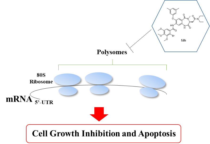 综上所述,该研究通过构建“优势骨架导向性”化合物库,结合基于表型的大规模活性筛选及药物化学优化手段,发现了具有超高抗肿瘤活性的化合物52b,该化合物通过抑制多聚核糖体的形成,抑制肿瘤相关蛋白的表达,进而诱导肿瘤细胞凋亡。