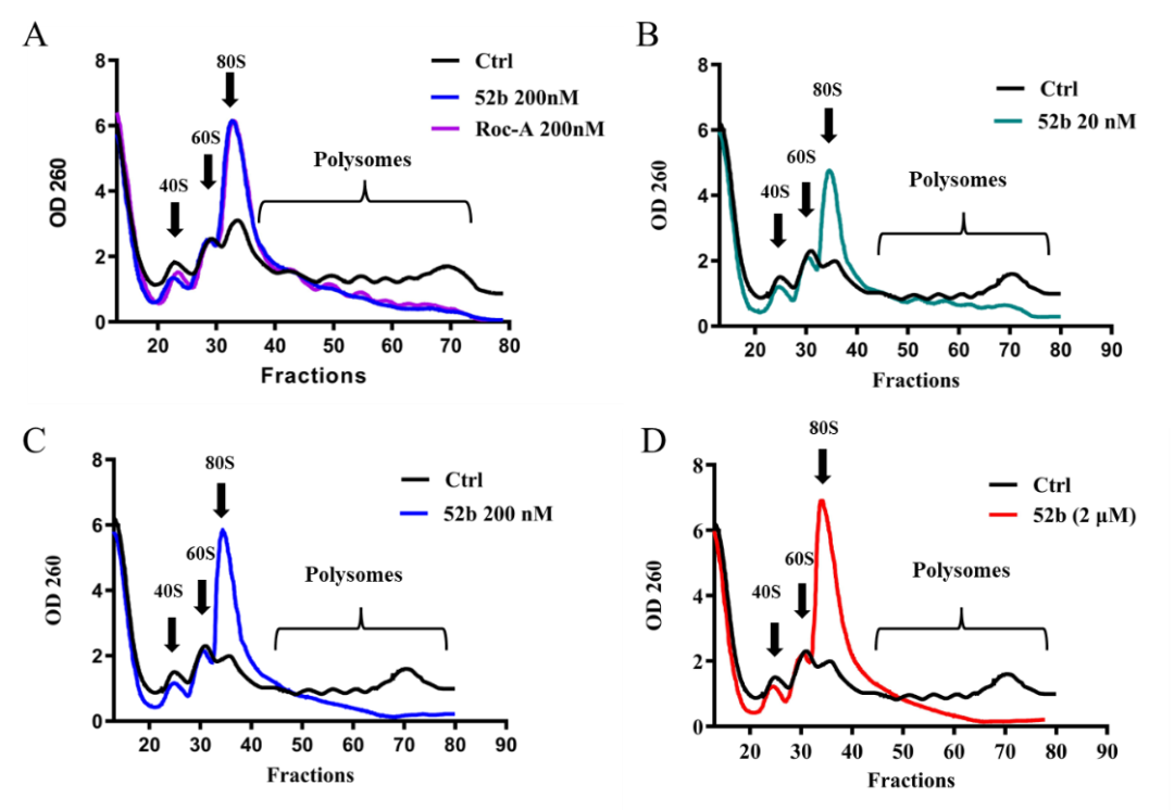 Polysome profile分析显示化合物52b抑制多聚核糖体的形成