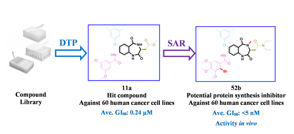 刘刚团队通过与美国国家癌症中心(National Cancer Institute)的长期合作,对课题组内的“优势骨架导向性”化合物库进行基于抑制癌细胞生长表型的活性筛选,发现了两类具有抗肿瘤活性的化合物,一类为苯并噻唑类衍生物,另一类为1,4-苯并二氮杂卓-2,5-二酮衍生物。进一步对1,4-苯并二氮杂卓-2,5-二酮苗头化合物11a深入的“构-效”关系研究,发现了具有广谱抗癌活性的化合物52b,其对9类60株人癌细胞的平均50%生长抑制浓度(GI50)小于5nM,具体“构-效”关系总结如下。