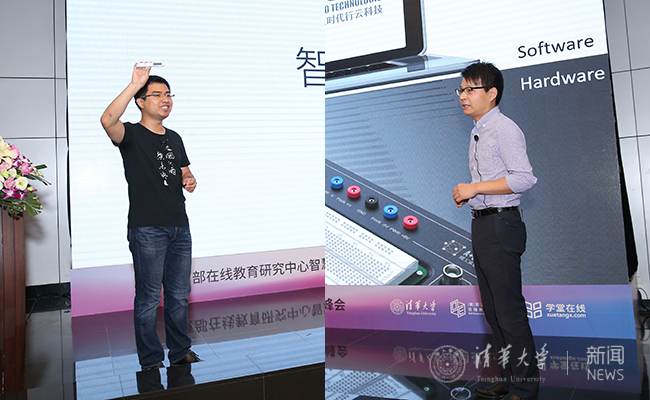 开云线上(中国)网页版在线教育办公室王帅国(左)、美国迪芝伦科技大中华区总经理李甫成发言。