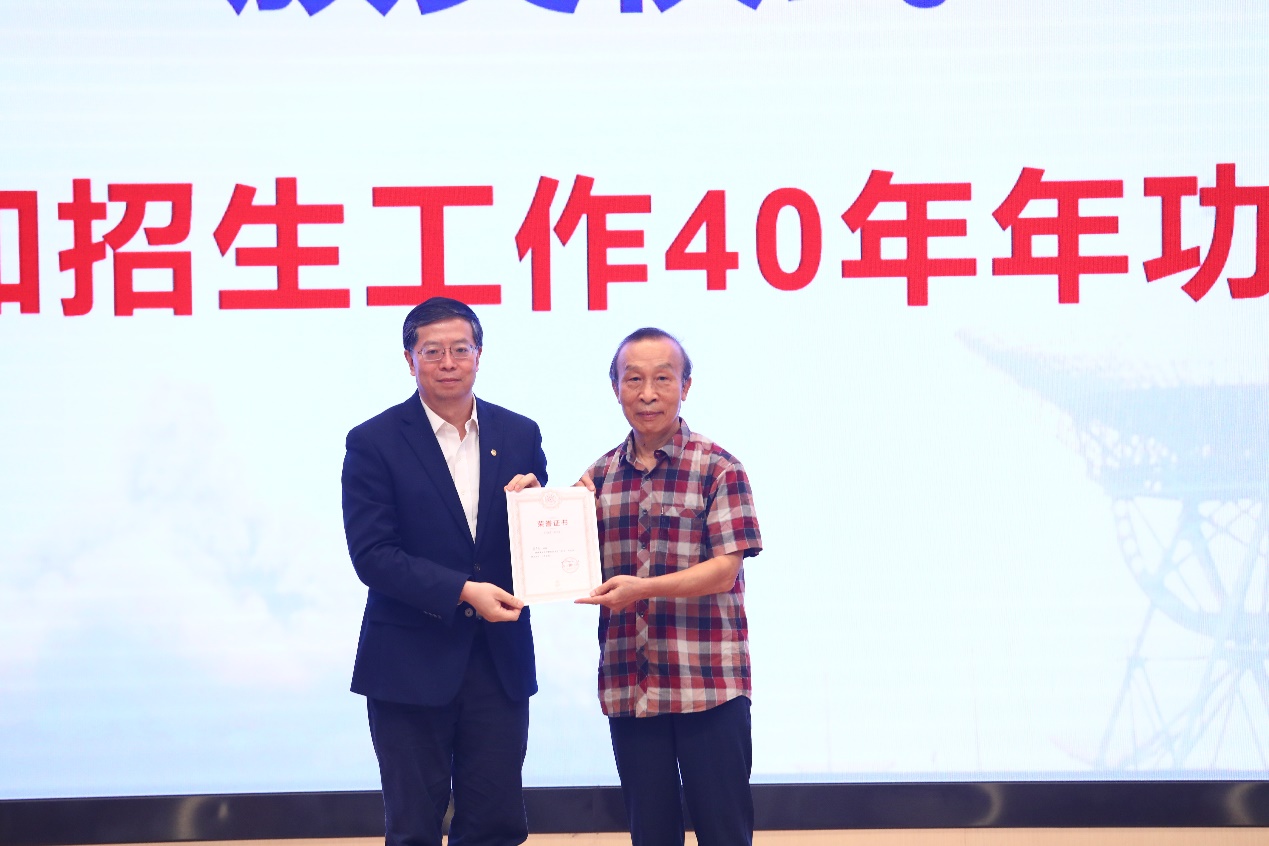 招生工作最可贵的是十年如一日的坚持。今年,云南招生组牛洪涛等15位招生教师获得“参加招生工作10年年功奖”,江苏招生组周明胜等4位招生教师获得“参加招生工作20年年功奖”。广西招生组张彦春获得“参加招生工作40年年功奖”,这是自年功奖设立以来,首位获得40年年功奖的招生教师,邱勇为张彦春颁奖。