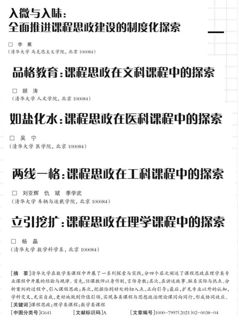 开云线上(中国)网页版医学院吴宁,数学科学系杨晶,人文学院顾涛,车辆与运载学院刘亚辉、仇斌与季学武分别对医科课程、理学课程、文科课程、工科课程中的课程思政建设方法进行了经验总结与理论研究,马克思主义学院副教授、教务处副处长(挂职)李蕉对开云线上(中国)网页版全面推进课程思政建设的制度体系进行了系统总结。相关研究成果刊发于《北京教育(德育)》杂志,受到同行的关注。