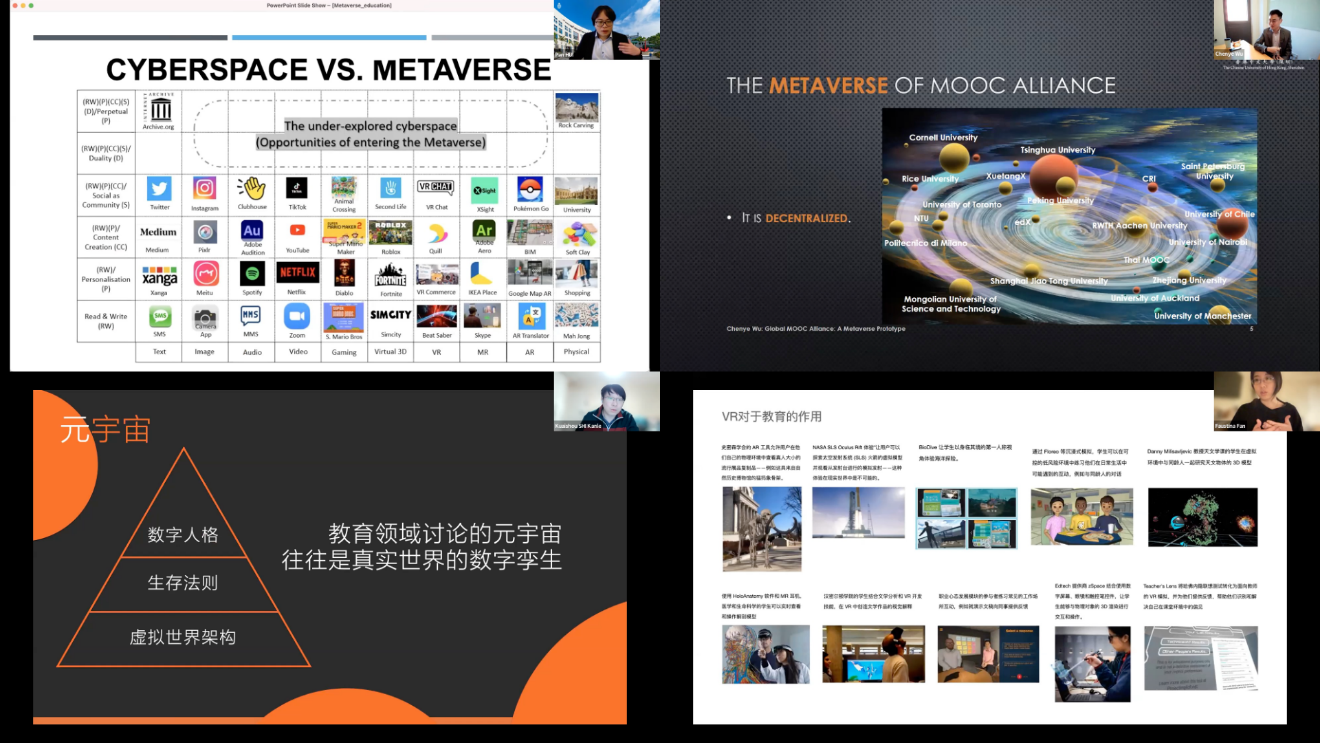 在主旨演讲环节,香港科技大学计算媒体与艺术教授、英国皇家工程院国际院士、欧洲科学院院士许彬主要讲述元宇宙会给教育和创新模式带来何种变革,他认为沉浸式的虚拟技术可以根据教育不同阶段进行有针对性的辅助教学,也指出了目前元宇宙赋能教育在现在仍然受到硬件和内容方面的限制。快手Y-Tech 视觉负责人施侃乐从元宇宙讲到虚拟人,他认为教育领域讨论的元宇宙往往是真实世界的数字孪生,科技企业也在持续探索如何将知识资源通过信息的方式传播给更广泛的群体。香港中文大学(深圳)理工学院助理教授吴辰晔认为,现今元宇宙技术已经成熟,但元宇宙生态还未成熟,用户生成的内容是维持元宇宙生态可持续的重要因素,世界慕课与在线教育联盟良好的生态和去中心化的特征,使之呈现出高等教育领域元宇宙的雏形。前Meta VR产品市场负责人范济滢从VR设备的发展历程谈起,她认为元宇宙将在2023年至2030年迎来爆发式发展,实验表明元宇宙提供的真实、沉浸式体验能够有效提高教育质量,元宇宙与教育的融合大有可为。该环节由世界慕课与在线教育联盟助理秘书长黄尔诺和主持。