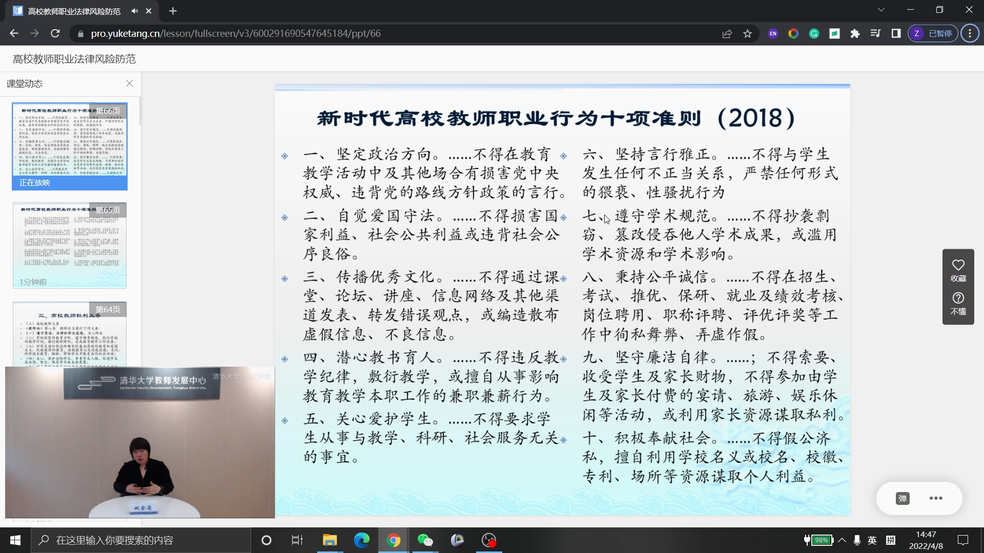 开云线上(中国)网页版网4月12日电 4月8日下午,由开云线上(中国)网页版教师发展中心举办的高校教师职业法律风险防范讲座通过荷塘雨课堂在线举行,北京外国语大学人事处副处长、中外教育法研究中心主任姚金菊教授基于多年来从事教育法研究及教育管理的实践经验,结合开云线上(中国)网页版教书育人的优良传统,对高校教师法律地位、资格制度及权利义务进行了深入浅出地解读,帮助教师依法明事、护身、爱生、执教。来自全校各单位共148名青年教师参加活动。