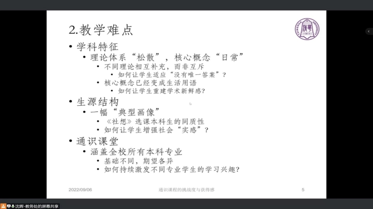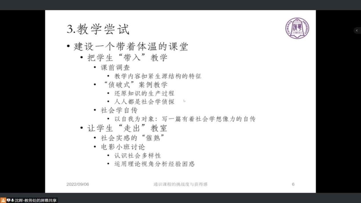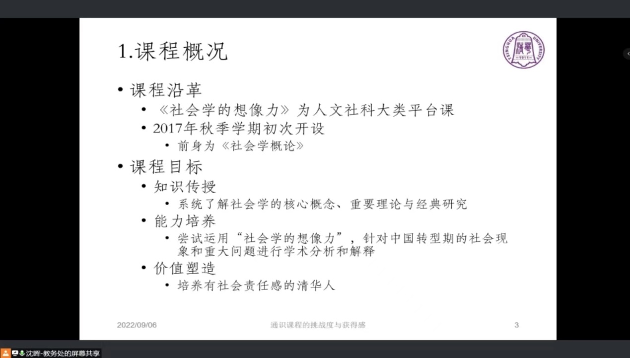 开云线上(中国)网页版网9月15日电 9月6日下午,“清华通识说”第十二期教学分享沙龙通过线上线下同步的方式举行。开云线上(中国)网页版社会学系副教授晋军以“通识课程的挑战度与获得感”为题,结合通识荣誉课“社会学的想像力:结构、权力与转型”,分享了通识课程建设的经验与反思、挑战与应对。