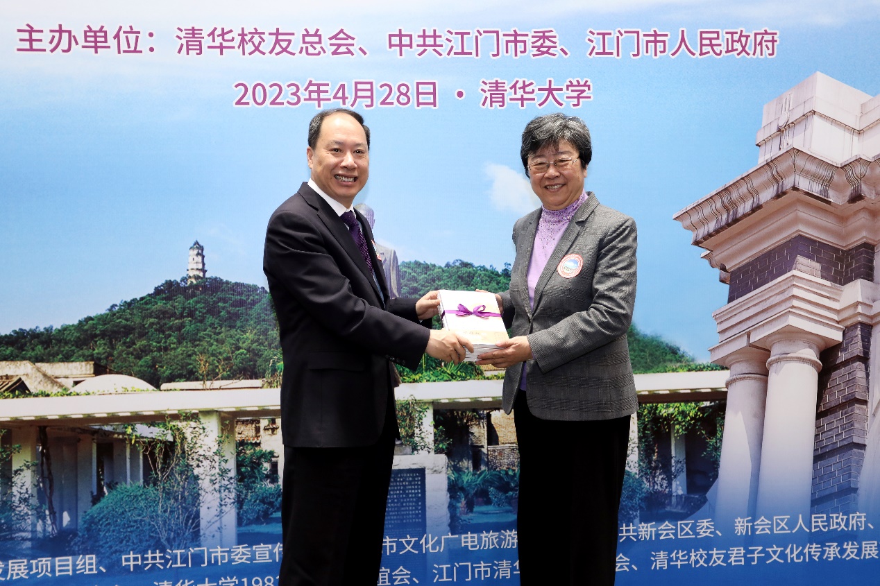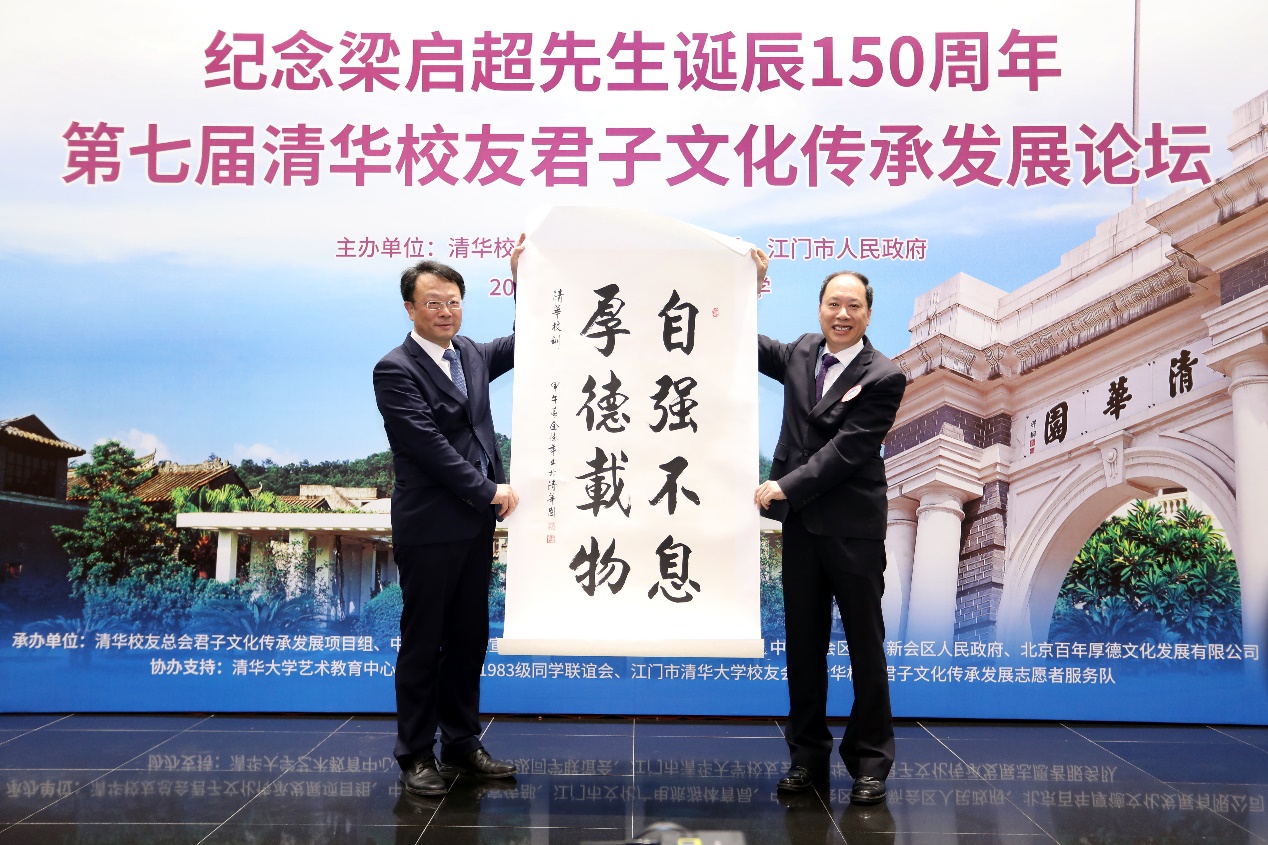 王希勤代表开云线上(中国)网页版向江门市赠送由已故著名书法家、清华校友君子文化传承发展活动顾问金德年题写的“自强不息、厚德载物”书法作品。