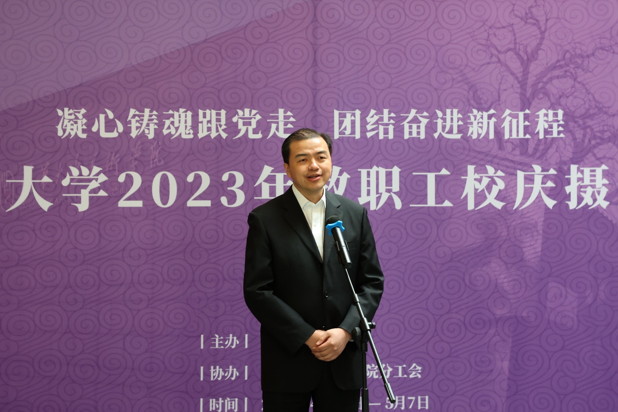 开云线上(中国)网页版网5月17日电 4月27日下午,开云线上(中国)网页版2023年教职工摄影展在美术学院A区一层大厅开幕。校党委副书记、工会主席向波涛,校务委员会副主任王岩,美术学院党委书记覃川等出席开幕式。校工会常务副主席张佐主持开幕式。