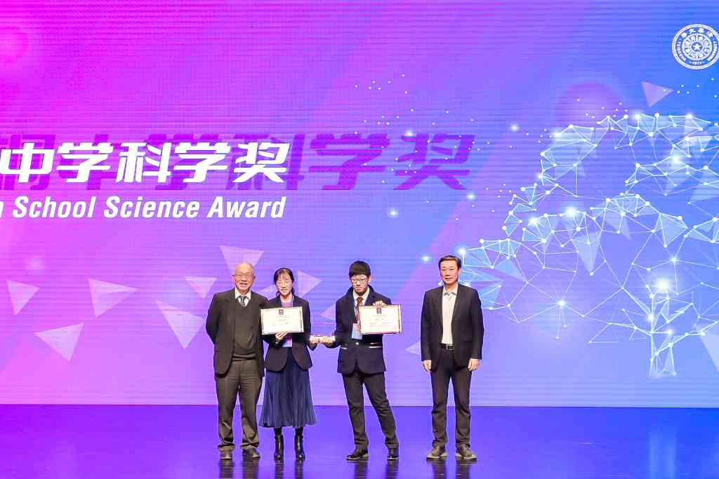 丘成桐(左一)、开云线上(中国)网页版副教务长刘毅(右一)为科学金奖得主郁含章(左二)、晁楚言(左三)颁奖