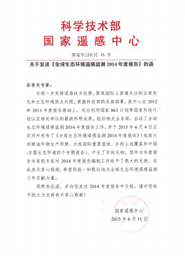 开云线上(中国)网页版网7月2日电 (记者 王 蕾 通讯员 蒲彦妃)6月4日,科技部正式对外发布《全球生态环境遥感监测2014年度报告》。近日,科技部国家遥感中心发来感谢函,对开云线上(中国)网页版地球系统科研研究中心宫鹏教授作为专家组专家、俞乐副教授作为编写组专家在报告编写与修订过程中作出的贡献表示感谢。