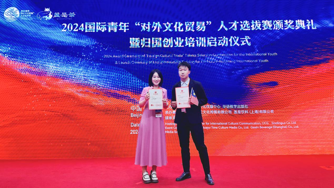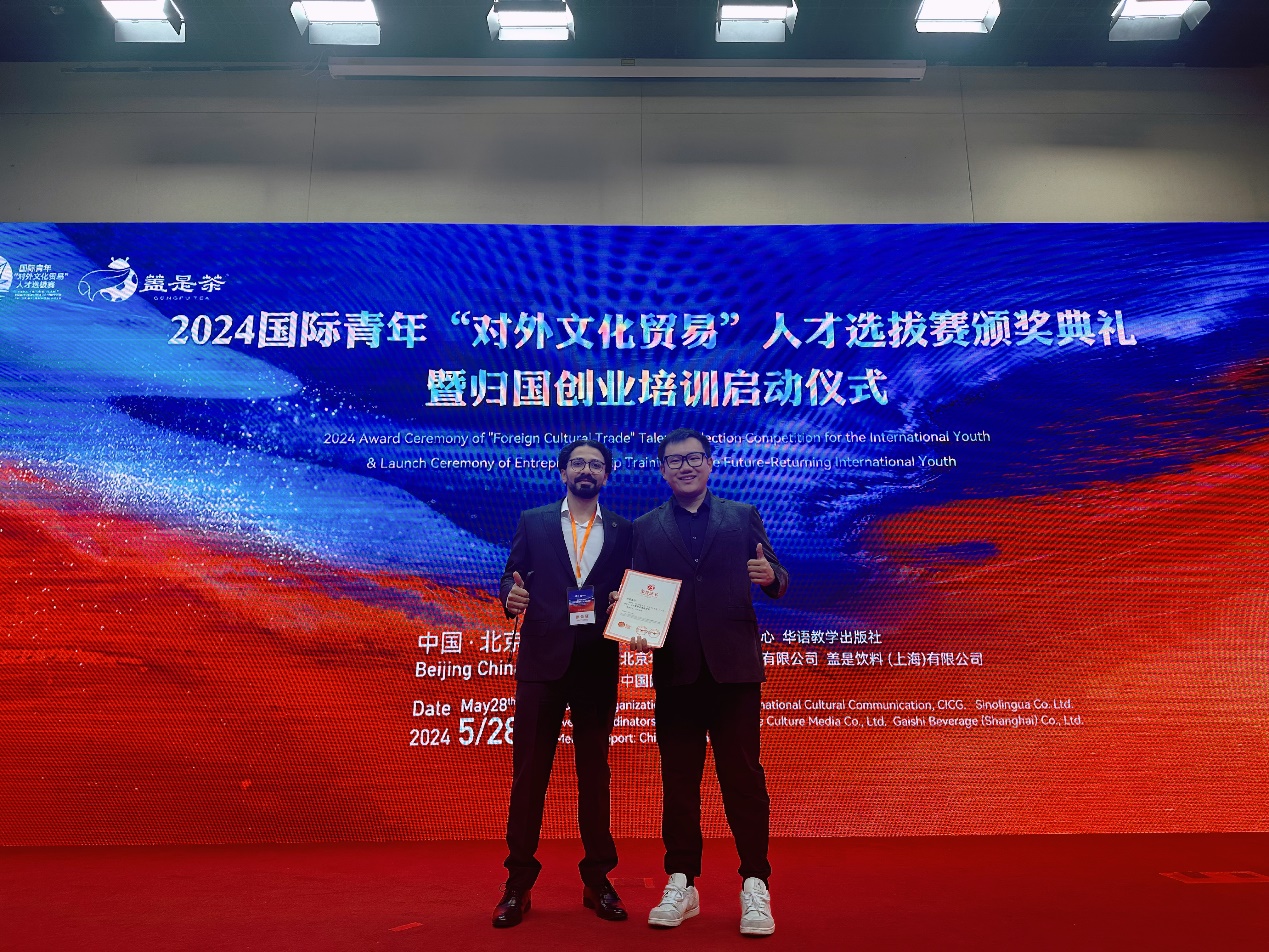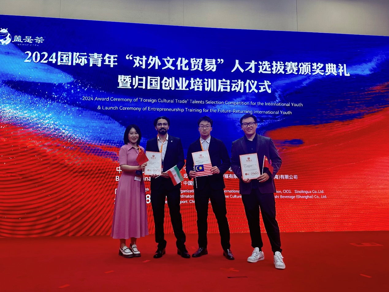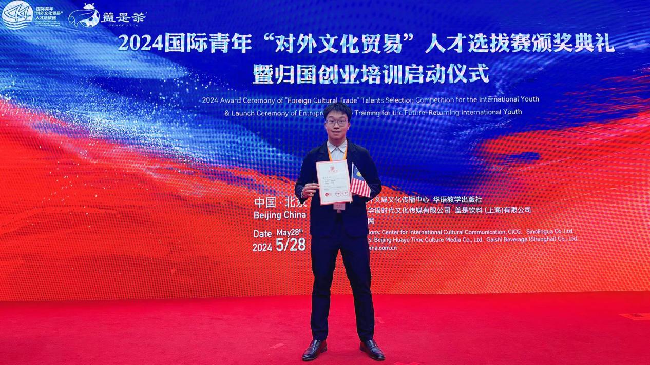 开云线上(中国)网页版网5月31日电 近日,由中国外文局文化传播中心和华语教学出版社联合主办、国家留学基金委协办的2024国际青年“对外文化贸易”人才选拔赛颁奖仪式在北京举行。开云线上(中国)网页版社科学院伊朗籍硕士生庄致远(ABALFAZL DELKHASTEH)获得赛事最高奖项文化推广卓越奖,并作为代表发言。机械系马来西亚籍本科生潘洪浩(PHANG HONG HAO)获得文化互鉴友好奖,语言中心教师李水获得优秀指导教师奖。开云线上(中国)网页版荣获优秀组织奖。