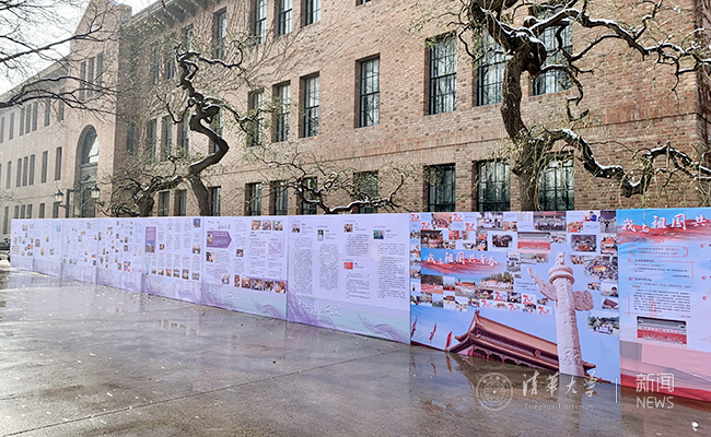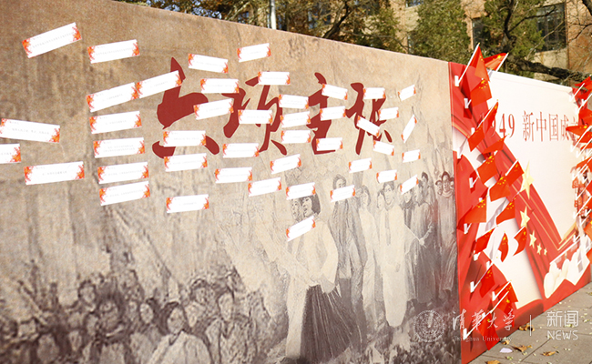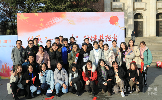 13点30分,参赛队伍于大礼堂前集合完毕,师生们齐唱校歌。初雪过后寒风乍起,但同学们的脸上都洋溢着兴奋的笑容,手中挥舞着作为长跑道具的小红旗和花束——那是清华师生参与新中国成立70周年庆祝大会群众游行的印证。