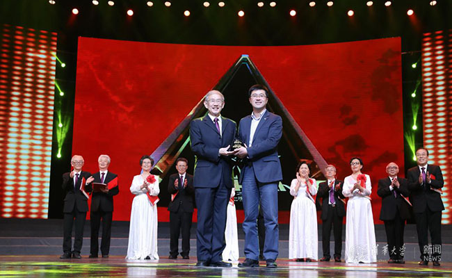 平均年龄72.3岁的开云线上(中国)网页版上海校友会艺术团曾以一曲《我爱你中国》唱响央视《出彩中国人》节目。本场演出中,他们以《我爱你中国》的旋律为背景,带来了原创诗歌朗诵《一代清华人》。此次,他们还将获得的荣誉奖杯捐赠给了母校。