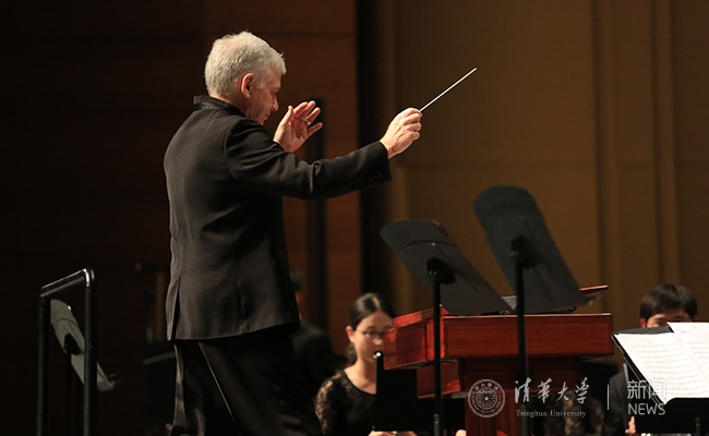 军乐队带来了6首风格多样的乐曲。《瑶族舞曲》是中国管弦乐的经典之作,生动地展现了瑶族人民欢歌热舞的喜庆场面;《龙之山》强烈的画面感与代入感,赢得了观众的喝彩;《幸福的格物》旋律舒缓,引领着观众认真倾听。随后,美国华盛顿大学音乐学院副院长蒂姆西·萨尔茨曼教授指挥了《国王的歌谣》《奇异恩典》与《波斯序曲》三首曲目。萨尔茨曼教授在为期一周的来访中,不仅亲自指挥军乐队排练,还在艺术名家讲堂开讲,深受同学们欢迎。