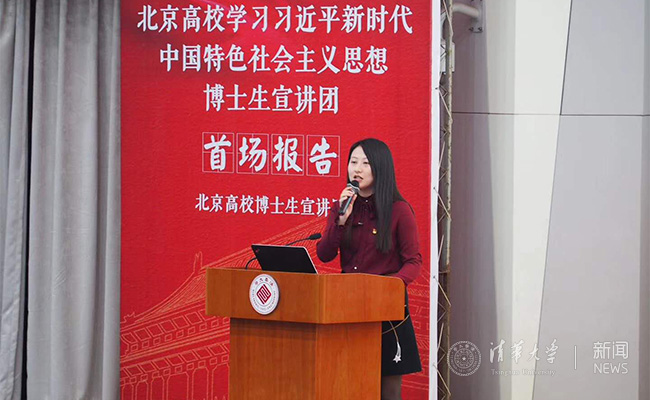 马克思主义学院2017级博士生李璎珞以“新时代,扬帆再起航;新青年,开启新征程”为题,将十九大的主题概括为“心、旗、路、梦”四字,随后从“新时代”“新理念”“新青年”三方面对“十九大”精神进行了独到的解读。在“新时代”方面重点讲述了从中共“八大”到“十九大”中国主要矛盾发生的三次变化,并结合亲身经历介绍了中国不平衡发展的现状;在“新理念”方面,详细解读了对“和谐发展构建生命共同体、和洽发展构建民族共同体、和平发展构建命运共同体”的独到见解;在“新青年”方面,号召清华学子做“有理想、有本领、有担当”的新青年,“到世界需要的地方去”。