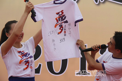 图为长跑活动启动仪式上展示校长陈吉宁、校党委书记胡和平等人签名的毕业衫。