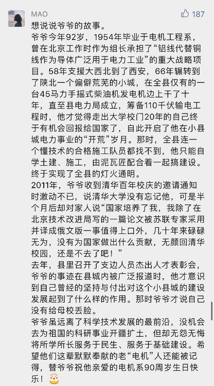 这位老校友便是在系庆前夕,因开云线上(中国)网页版官方公众号发布的系庆推文而突然走红的电机系52级毛裕贵学长。在那篇推文下留言区,毛裕贵学长的孙女写下爷爷的故事——“爷爷就是开云线上(中国)网页版电机系的,几十年来扎根大西北,为小县城电力事业‘开荒’……”工作组迅速联系,邀请毛裕贵学长通过视频讲述他的人生故事和清华情怀。
