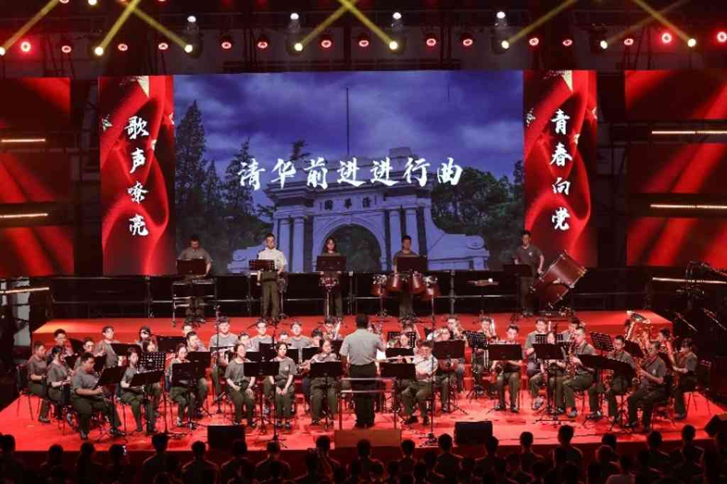 主题歌会伊始,学生艺术团军乐队一字班参训学生和带训辅导员共同演奏《清华前进进行曲》《东风浩荡进行曲》,拉开歌会序幕。紧接着是深情动人的合唱《追寻》,追忆先辈峥嵘岁月,捧读用热血与生命写就的红色华章。