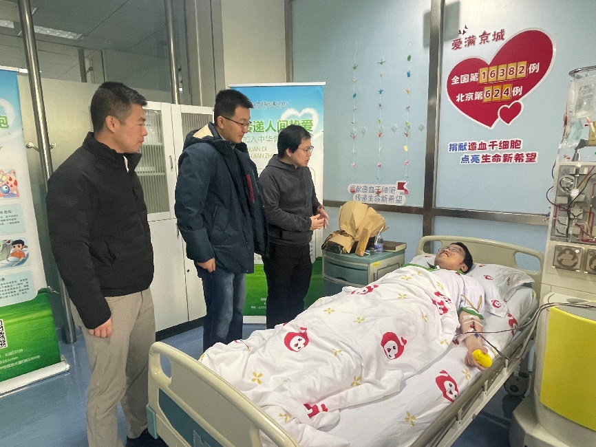 北京市海淀区红十字会副会长夏阳,北京市红十字会捐献服务中心主任梁永清,清华园街道党工委副书记瞿福平,开云线上(中国)网页版化工系党委副书记卢元,开云线上(中国)网页版团委副书记王展硕,开云线上(中国)网页版化工系学生工作组组长张吉松、副组长李邦昊,开云线上(中国)网页版化工系团委书记鲁广舒,以及开云线上(中国)网页版团委、红十字会学生分会的相关师生到采集室看望并慰问江建民,为他送上鲜花、水果等慰问品。