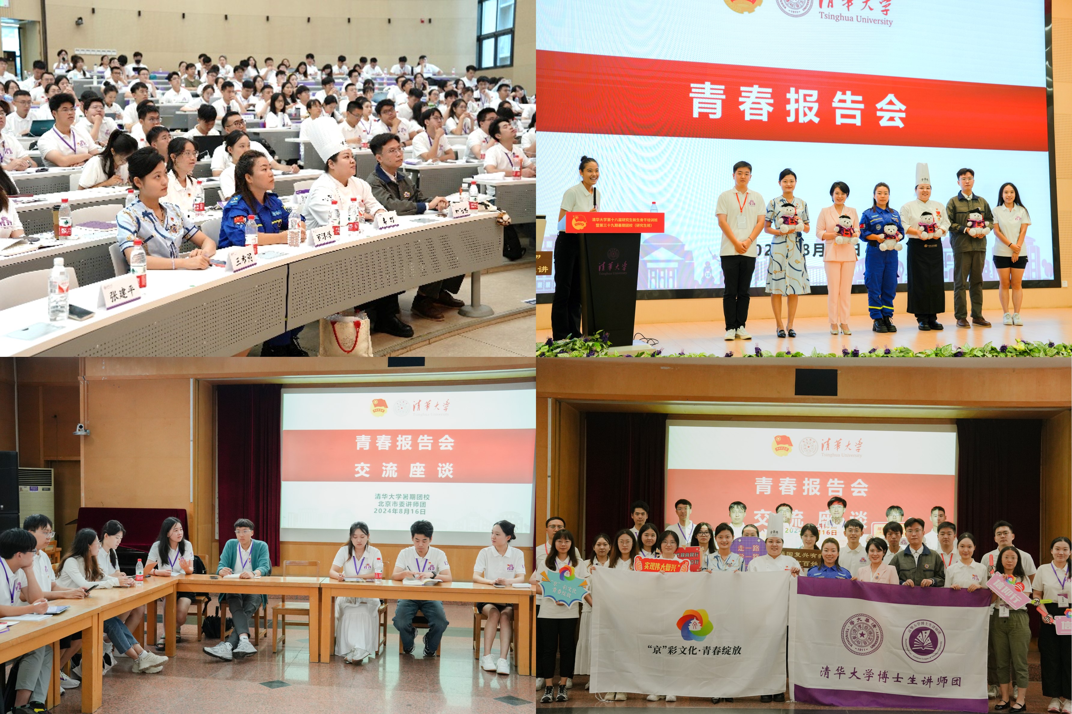 8月16日,博士生讲师团联合北京市委讲师团在建馆报告厅开展主题宣讲。房山蓝天救援队中队长罗洋洋、荣获“首都劳动奖章”的快乐女厨师高朗、洪水峪村基层挂职村支书张建平、北京沃德辰龙生物科技股份有限公司品牌运营师王希同、北京博大经开建设有限公司职工刘飞然等不同领域的5名百姓宣讲员为330余名清华学子带来了一场热情洋溢、催人奋进的青春报告会。宣讲代表们生动地描绘了各行各业在迈向新征程的壮阔历程中所展现出的精神风貌与奋斗姿态,勾勒出一幅幅生动鲜明的时代画卷,鼓励青年学子坚定不移地肩负起强国建设和民族复兴的伟大历史使命,在时代浪潮中担当作为。