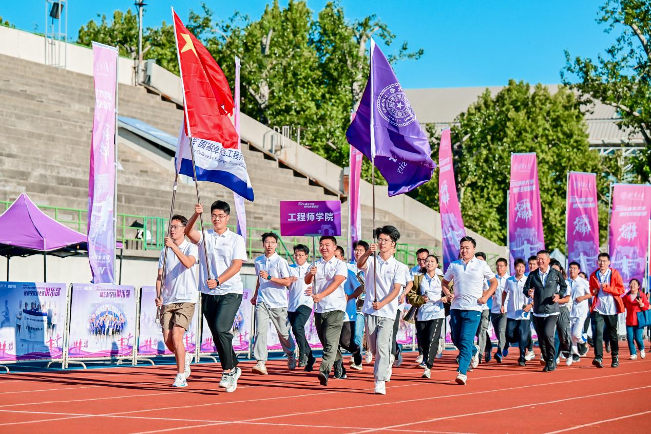 启航跑环节,1600余名师生以院系为单位,手持国旗、校旗、院旗,以“启航”为名在东大操场集体奔跑,为校园注入青春力量。