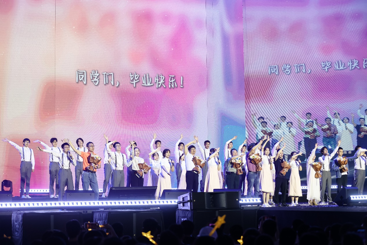 “念念不忘”篇章中原创毕业歌《清旅》旋律悠扬、词意动人。短剧《我想在清华做的100件事》用幽默而温情的方式,演绎了那些让人难忘的校园瞬间。毕业金曲串烧让整个场馆化作星光摇曳的合唱海洋。国标舞《阳光下》用热情奔放的舞姿展现了青春活力。辅导员代表以一曲深情的《我爱你中国》,将个人成长与国家情怀紧密相连,唱响了清华学子“又红又专,全面发展”的赤诚之心。