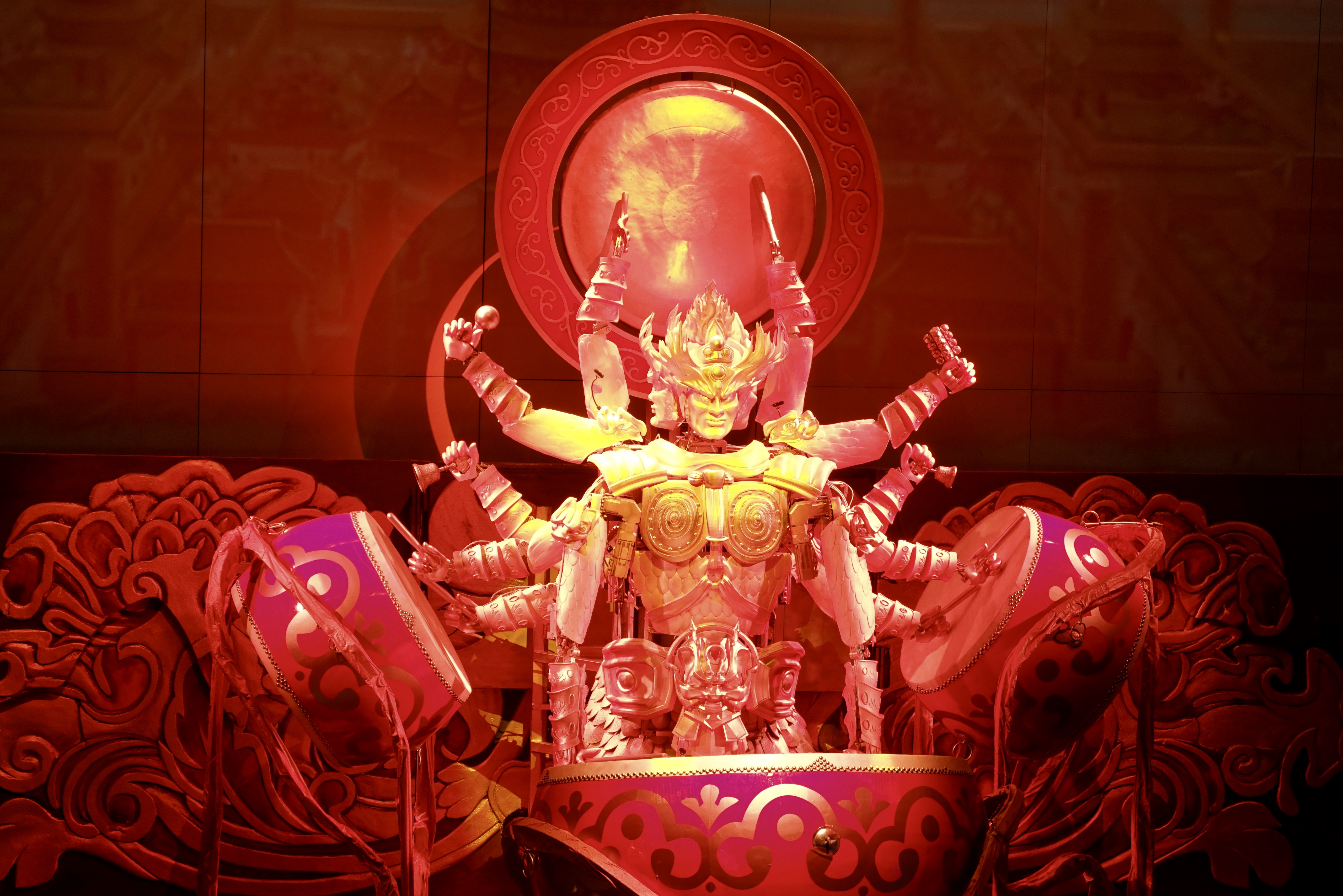 机器人演员在演出中分别演奏竹笛、箜篌和击鼓,还会“说相声”。相比之前的演出,在这一版演出中,机器人具备了更加丰富的面部表情和更加细腻的肢体动作,也能够与真人演员进行更加默契的配合。