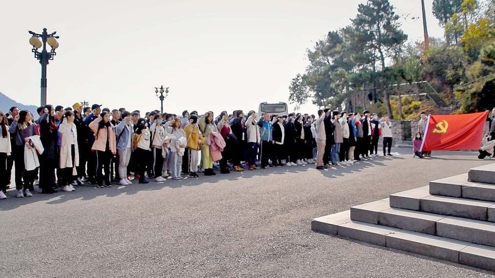 随后,全体同学一起登上白河主坝坝顶,纵览密云水库,共同唱响水利系系歌——《水利建设者之歌》。“从那黄河走到长江,我们一生走遍四方……”辽阔祖国,万里山河,滚滚江水,辉煌灯火,水利前辈们艰苦奋斗、投身强国伟业的精神,穿越六十年的风雨征程,感召着在场的每一位新时代青年们。在白河主坝纪念碑前,党员们面向党旗,重温入党誓词,立志将青年党员的责任与担当践行在祖国大地上。