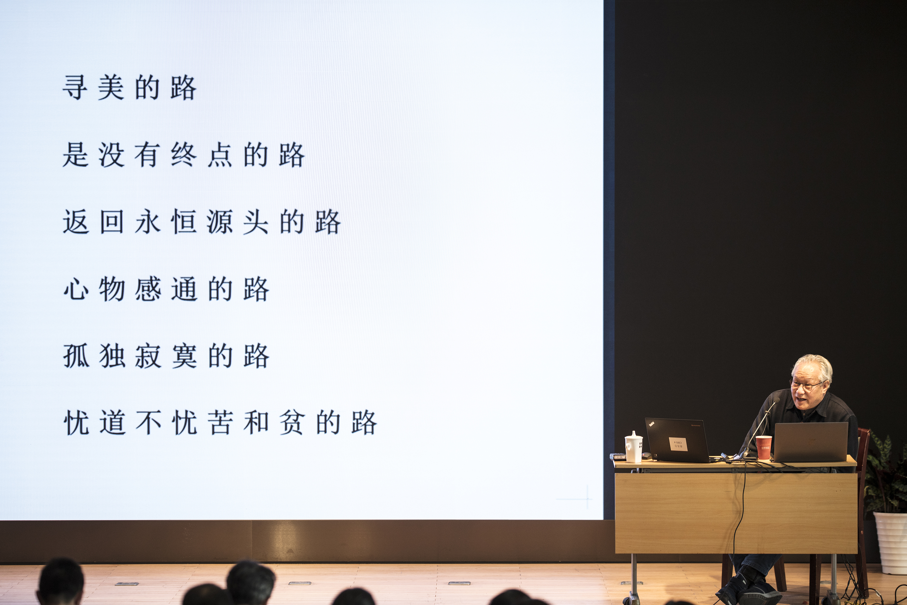 围绕“寻美的路是返回永恒源头的路”这根主线,刘巨德从有趣又富含哲理的小故事和自己的艺术实践体会讲起,带领大家走进寻美之路。他表示,寻美的路是没有终点的路。实践证明,在寻美的道路上,回到源头就意味着独立自由,是艺术的开悟之路。