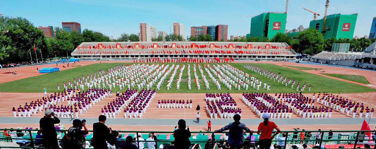 开幕式上,1100名清华教职工以花穗健身操和太极功夫扇表演为110周年校庆献礼。花穗健身操队伍在《我和我的祖国》歌声中欢快起舞,表达了广大教职工祝愿“祖国万岁,清华加油”的心情和蓬勃向上的干劲。太极功夫扇由传统武术的部分精华动作组合而成,阴阳转换,开合有序,刚柔并济,开扇如蝶翼,合扇如短剑,体现出中华武术的魅力。