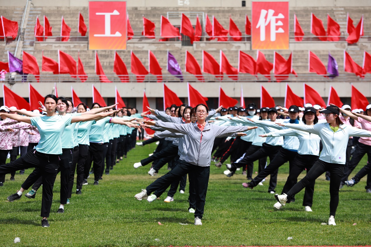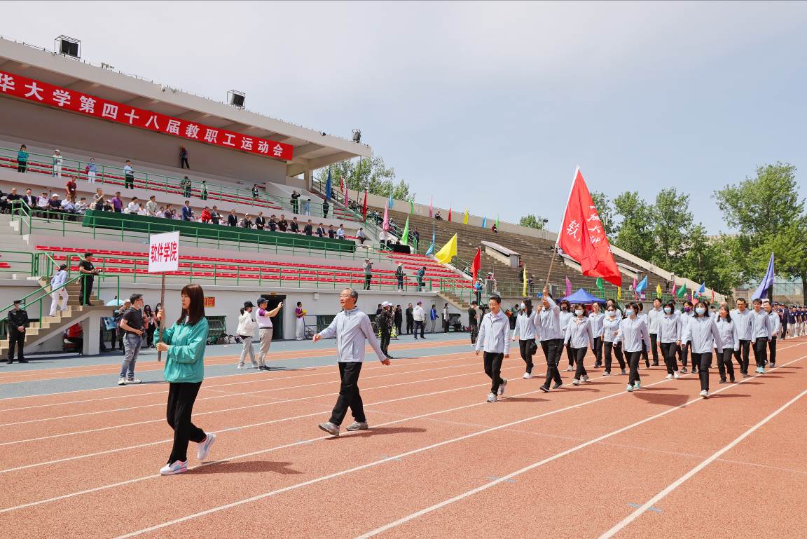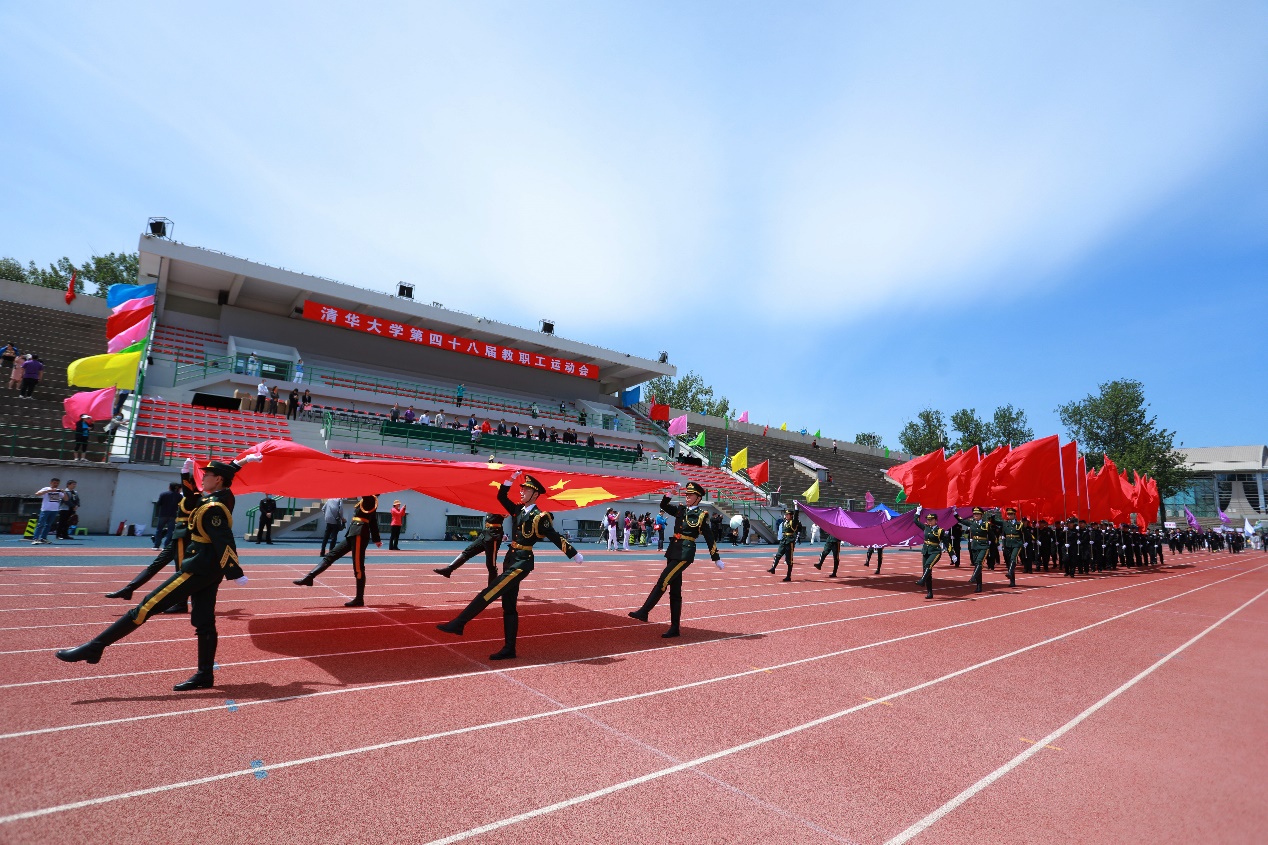入场式上,国旗班,院系、部处和直附属单位等61个分工会的1400余名教职工依次列队步入操场接受检阅。他们步伐整齐,呼喊着嘹亮的体育精神口号,展现出清华人积极进取、昂扬向上的精神面貌。软件学院队伍在孙家广院士的带领下接受检阅,现场掌声雷动。土水学院刘宇飞、体育部贾昱冰分别代表运动员、裁判员宣誓。在第九套广播操表演环节,教职工们伴随着轻快的节奏,动作整齐划一,洋溢着青春活力。“升国旗,奏唱国歌”,五星红旗在与会全体教职工的注目下冉冉升起,迎风招展。