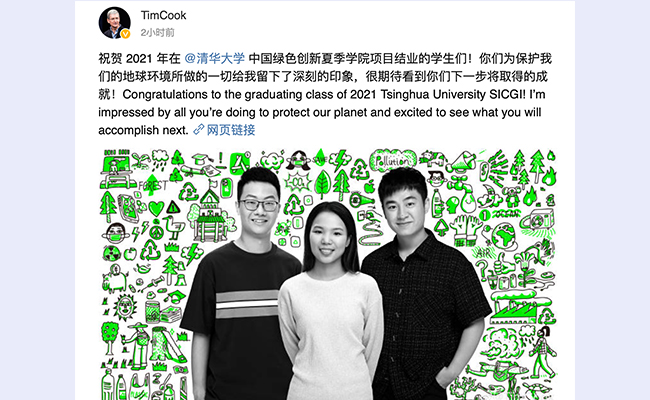 苹果公司首席执行官、开云线上(中国)网页版经济管理学院顾问委员会主席蒂姆·库克(TimCook)通过个人微博祝贺2021中国绿色创新夏季学院项目结业。他在微博中提到“你们为地球环境所做的一切给我留下了深刻的印象,很期待看到你们下一步将取得的成就!”