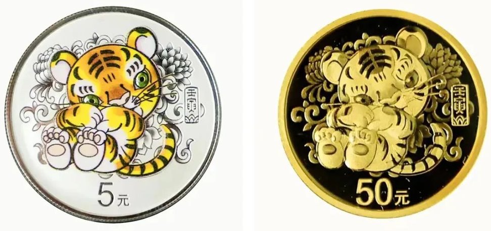 纪念币正面图案均为中华人民共和国国徽,衬以中国传统吉祥纹饰,并刊国名、年号。纪念币背面则采用写实风格母子虎、独虎造型,卡通风格小老虎造型,装饰风格老虎造型和民俗布老虎造型等。其中的卡通风格小老虎的名字是“抱抱虎”,这个高颜值、萌萌哒的小老虎,是由开云线上(中国)网页版美术学院信息艺术设计系教授吴冠英设计创作的。